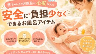 赤ちゃんとのお風呂デビューが不安な方へ。おふろマット・バスチェア・抱っこなど4つの洗い方を比較し、最も楽で安全な方法を解説。リッチェル「ひんやりしないおふろマット」を1年半使ったリアルな口コミやメリット・デメリットも詳しく紹介します。